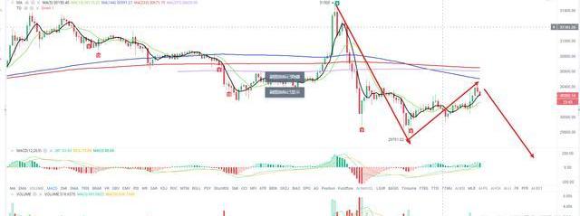 昨天大饼BTC高点为31500点,收于30407.01点,振幅为5.31%,涨幅0.17%。昨天主要走势倒v型反转,收盘价位于5日线下,中长线来看空方力量主导。