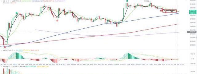 之前在周线分析说到,大饼btc行情一直处于在144和233周线直接来回波动。虽说大饼跌破3w,但是还是处于该区间内震荡,大方向级别还没有出来。只要完全突破该区间,才知后续情况如何,当下行情就是震荡为主。但是从盘感直觉来看,至少在打个新高,才会引起大的回调下跌。