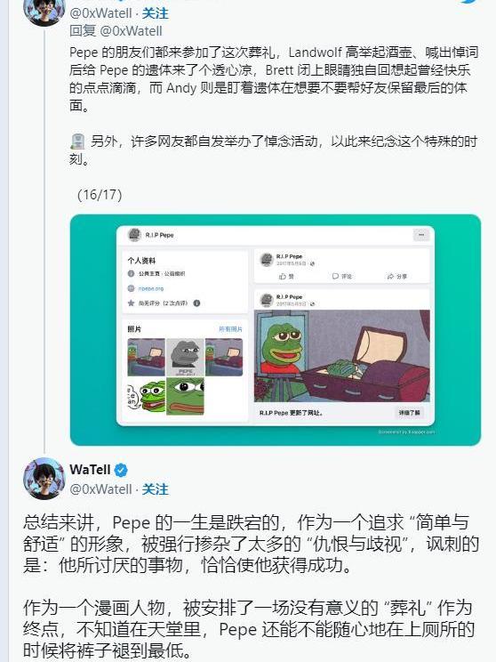 在2017年5月8日,马特·弗里发布了一篇名为《RestinPeace,Pepe-Thememe'screatorkillsoffthefroghijackedbythealt-right》的新漫画,正式宣告了Pepe的死亡。