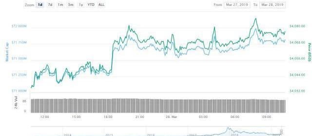 比特币目前以4065美元的价格上涨了近2.5%。今天比特币价格的上涨使得加密货币市场总体价格上升,EOS上涨超过15%,而LTC上涨了近5%。