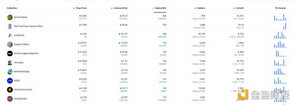 24小时NFT交易量、交易量前十项目 数据来源:Coinmarketcap