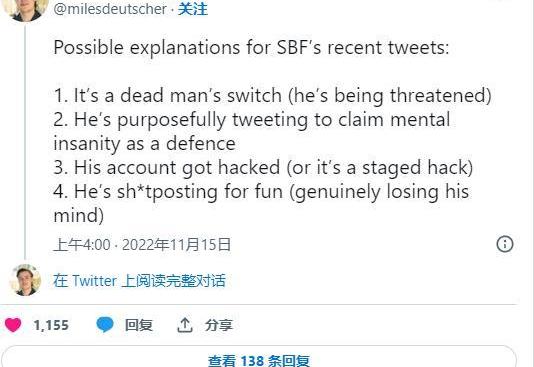 SBF最近推文的可能解释:1.这是一个死人开关2.他故意如此发推,以证明自己精神错乱来作为辩护3.他的帐号被骇了4.他发文是为了好玩