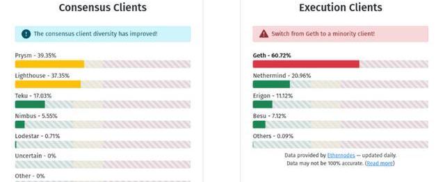 每个以太坊节点运行一个共识客户端和一个执行客户端。目前,没有共识或执行客户端占网络的2/3以上。这意味着如果在其类别中份额低于1/3的客户端出现错误,网络将照常运行。如果在其类别中拥有1/3到2/3份额的客户有错误,链将继续添加块,但它会停止敲定块,从而为开发人员提供时间进行干预。