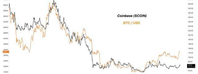 比特币与Coinbase股票比较图表