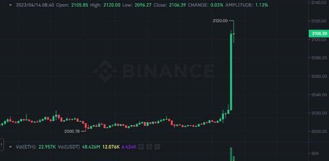 以太坊今晨价格涨破2100美元,最高报2,120美元,近24小时涨超10%。全网暴伤