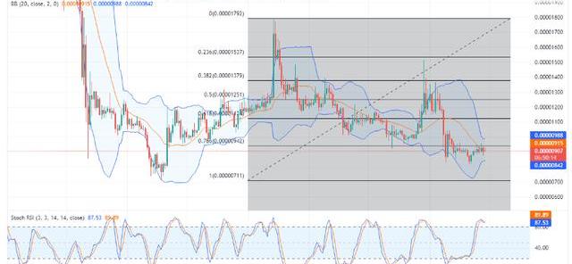 在SHIB/USD市场,价格活动转为看跌。因此,柴犬价格似乎正在走低支撑位。连续两个交易日仍然对卖家有利,因为技术指标进一步一致预测更多下跌。使用的随机RSI指标执行了向下交叉。然而,RSI线并未急剧向下。也许这可能是因为一些购买可能已经开始。此外,通过仔细检查最后的价格烛台,可以看出它的实体很短。这可能预示着可能的价格反转,可能会突破阻力位0.00000942美元。