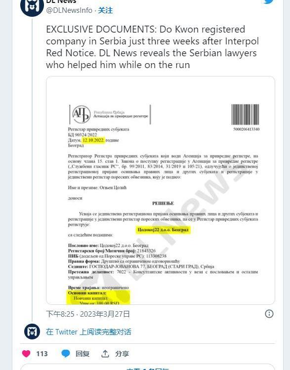 去年9月,国际刑警组织发布红色通缉令三周后,道权和韩在塞尔维亚注册了一家公司,令人震惊。根据从塞尔维亚商业登记处获得的官方记录,Kwon和Han于2023年10月12日开设了一家名为Codokoj22dooBeograd的公司。