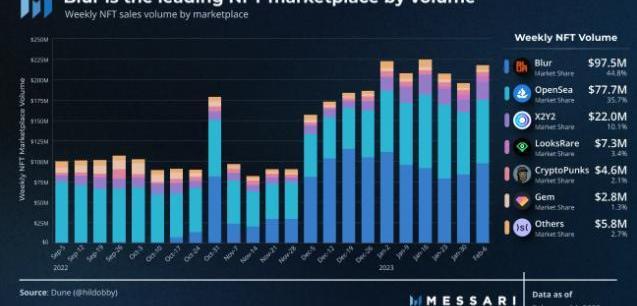 根据Messari追踪的数据,自2022年10月推出以来,Blur已成为领先的NFT聚合器,占每日NFT交易量的40%至60%。