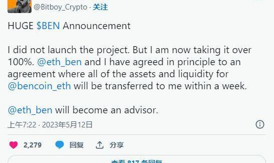 阿姆斯特朗后来从Ben.eth手中接过该项目的控制权,金额不详。