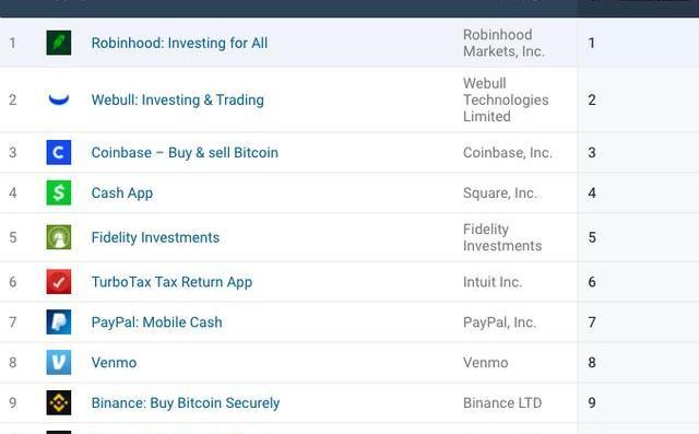 苹果AppStore下载量最高的10款金融应用来源:Similarweb更进一步的迹象表明,糟糕的宣传并不像看上去那么糟糕,零售交易应用Robinhood上周的应用下载量也出现了大幅增长,因为用户和评论人士都抱怨该应用对他们行为的任意限制。