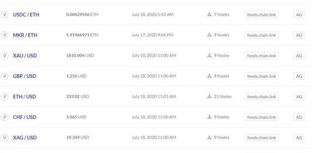 Chainlink已经上线了多种虚拟货币、法币和大宗商品的价格数据,每一个报价都有众多使用方。