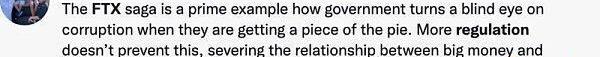FTX灾难是政府在分一杯羹时对腐败视而不见的一个典型例子。更多的监管并不能阻止这一点,切断大笔资金和竞选捐款之间的关系可以。这笔钱应该退还给客户。