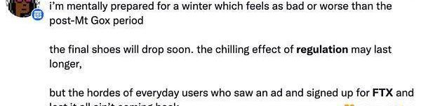 我已经做好了迎接冬天的心理准备,这个冬天的感觉和MtGox后时期一样糟糕或更糟。最后的鞋子很快就会落地。监管的寒蝉效应可能会持续更长时间,但是那些看到广告并注册FTX并最后失去一切的日常用户群不会回来了。