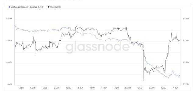 然后是大家最关心的Binance的资产情况,咱们今天继续。首先仍然是BTC的存量,可以清楚的看到,SEC冻结BAMtrading的信息并未加剧用户提现的恐慌,当然提现仍然是在增加的,这是毫无疑问的,只是增加的幅度相比过去的24小时要减少了不少,截止到北京时间13点BTC在Binance内的存量为68.7万枚,昨天中午11点的数据是69.3万枚,在26小时内下降了6,000枚BTC左右,只是昨天的12小时内的一半都不到。即便是按照目前的提现强度,Binance的剩余Billions项目组ETH还可以维持用户提现165天。