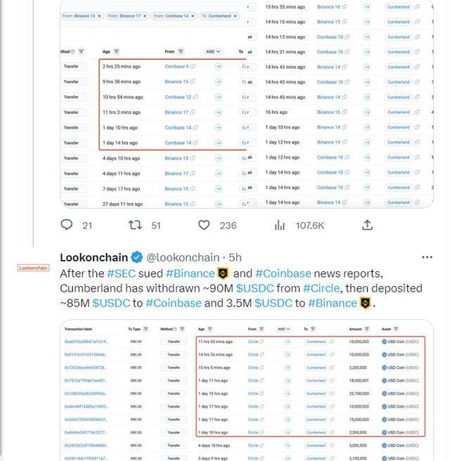 据@lookonchain监测,自SEC起诉币安、Coinbase被新闻报道后,加密做市商Cumberland从Coinbase提取了2万枚ETH,从币安提取了4,850枚ETH,共计24850枚ETH。此外,Cumberland还提取AXS、SHIB、COMP、LINK、CRV、AAVE和RNDR代币。在此期间,Cumberland从Circle提出了约9000万枚USDC,将约8500万枚USDC存入Coinbase,将350万USDC存入币安。