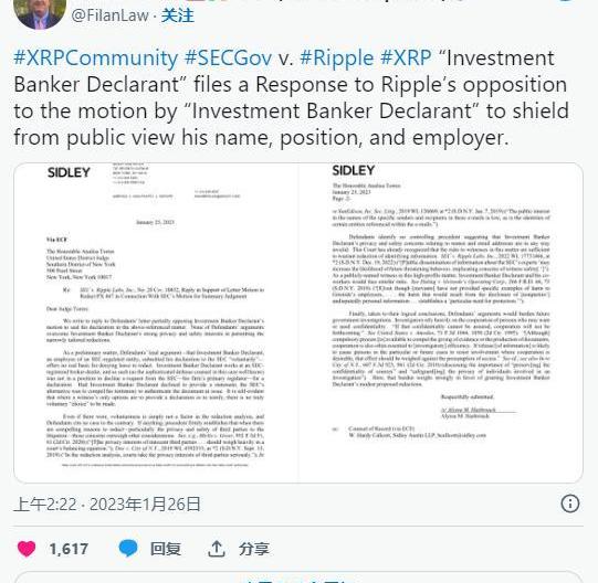 Ripple-SEC的审判在2023年1月发生了意想不到的转折,当时Ripple对一位被称为“投资银行家声明人”的未具名个人的声明提出反对动议,该人试图将他们的个人信息保密,包括他们的姓名、职位、和雇主。