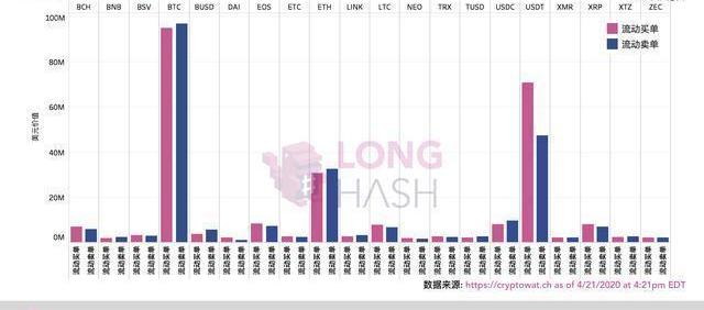 流动买单是Cryptowatch定的一个指标,是该平台追踪到的市面上最佳出价在100基点内的所有买单的总和。流动卖单也是同样的概念。也就是说,这个数据能够显示订单栏上各币种按市价1%以内的价差交易的挂单量。