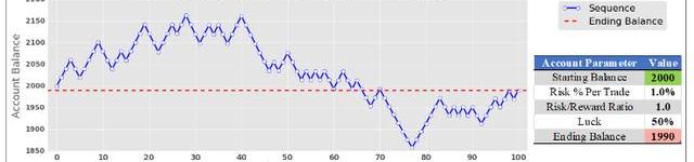第一个随机漫步如下图所示。它模拟了一个交易者从2千美元的账户开始,每笔交易的风险为1%,风险/回报比率为1:1,并且有50%的运气。运气好的交易大约占一半使最终结果可预测。一百次交易后,期末余额与开始时几乎相同。