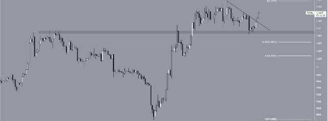 TOTALCAP自3月27日以来一直在上涨,并且正在创造三个连续的看涨烛台。反弹验证了1.09万亿美元的水平支撑区域,并突破了下行阻力线