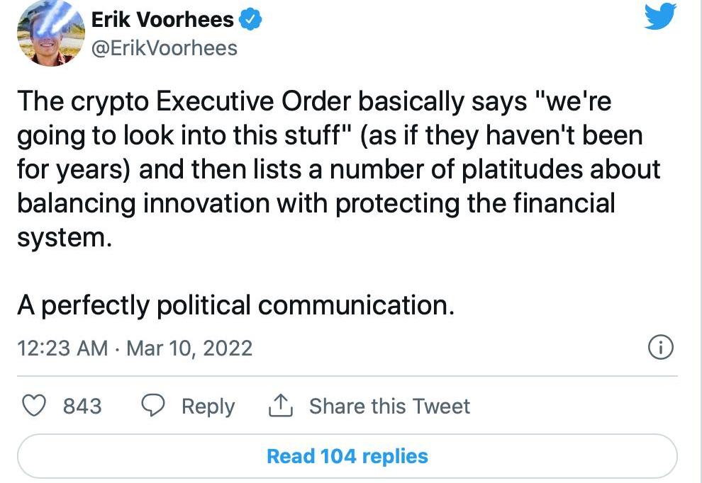 坚定的自由主义者和加密货币平台ShapeShift的创始人ErikVoorhees或多或少地将拜登的行动视为更多的相同内容: