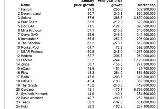 下图显示了2023年1月中型及以上代币的涨幅百分比与上一年的涨幅对比。研究图表&得出自己的结论。希望这是一个明显的。