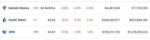 今日平台币板块整体也跟随BTC继续震荡,24小时级别来看,库币平台币KCS下跌0.3%,HT下跌0.1%,OKB下跌1.0%,BNB下跌1.7%。