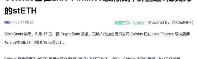 在上个月已破产的加密借贷公司Celsius已在LidoFinance取消质押42.8万枚stETH。