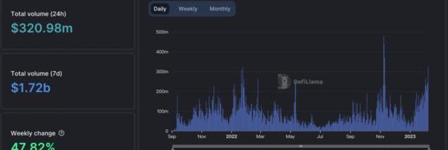 此外,DefiLlama的数据显示,自2023年以来,Arbitrum上的DEX交易量一直在上升。