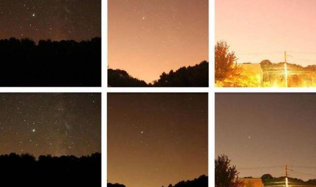 图解:从乡村(上)到城市(下)的夜空。这些并不是原始天空或严重污染天空的极端例子,而是典型的例子,在美国大多数地方开车2小时你就能发现这些变化。