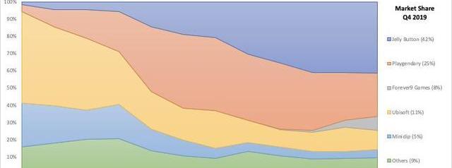 Playgendary则是该品类惟一一个真正有实力改变市场的公司,多个产品占据了25%的市场份额。从时间上来看,该公司的游戏在不断进化,比如2017-2018年专注于超休闲游戏,到2018年就开始深度挖掘复合休闲游戏的潜力。尽管如此,Playgendary在2019年第四季度的收入依旧同比下滑23%。导致这个结果的原因有两个: