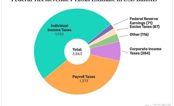 数字资产管理公司Coinshares公司高管梅尔滕·迪米尔斯在最近发布的一条推文指出,税收其实是美国政府的全部计划:“是时候说些有趣的事实了,政府如何支付?很简单——用联邦政府征收的税金。根据TheBalance给出的数据,美国预计将在2021年征收接近4万亿美元的税金,其中超过75%来自普通人的薪水,也就是个人所得税和工资税。”