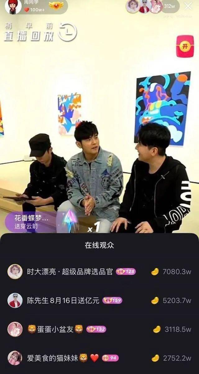 打赏方面,据中新经纬记者粗略统计,最终周杰伦直播首秀共计收到约2.2亿快币打赏,折合人民币约2200万元。颇有意思的是,打赏榜前四名总计贡献了1.8亿快币,占约82%。这四人分别为“时大漂亮”“陈先生”“蛋蛋小盆友”“爱美食的猫妹妹”,打赏快币数量分别为7083万、5306万、3118万、2752万。