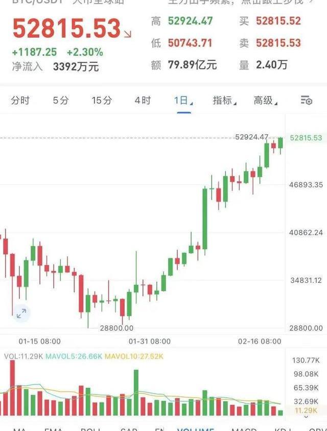 在机构资金入场扫货之下,比特币近期屡屡创出历史新高。仅三天时间,币价又涨近4000美元,2月19日,比特币价格一度突破53000美元,即每个比特币约合人民币34.2万元。