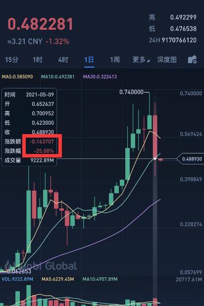 火币网数据显示,5月9日,DOGE盘中最大跌幅超35%,最终收跌25.08%。