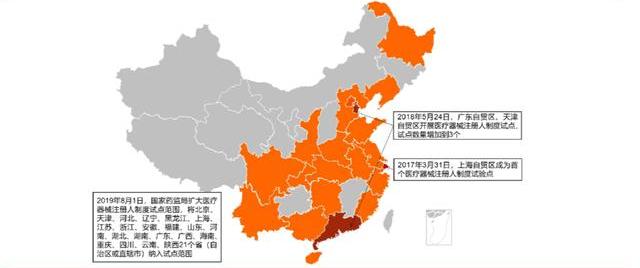 2017年,国务院印发《关于深化审评审批制度改革鼓励药品医疗器械创新的意见》,标志着医疗器械上市许可持有人制度正式在国内开始施行。此次政策组合拳从研发、临床试验、产品所有者权益和生产企业整条产业链的源头进行政策引导,鼓励药品和医疗器械的创新,简化监管流程,提升审批速度。2019年8月,国家药监局发布《关于扩大医疗器械注册人制度试点工作的通知》,将试点范围扩大至21个省市。截至2019年12月底,21个试点省市全部发布了医疗器械注册人制度实施方案。