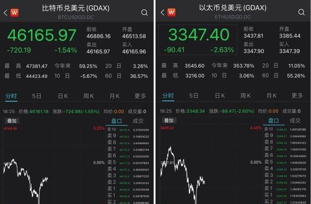 在闪崩过后,比特币、以太坊价格迅速回升,比特币围绕46000美元上下波动,以太坊则集中在3400美元波动,但最终均未能收回日内跌幅。