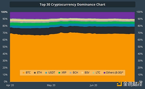 总体而言,以太坊和比特币的市场主导地位在2020年二季度一共增长了1.9%,市值增加了50亿美元。不过有市场分析人士认为,这两大加密货币的增长主要“得益于”瑞波币(XRP)市场份额的亏损。在2020年二季度,瑞波币从市值排名第三的位置下跌到第四(被Tether超越),其市场主导地位占比也下降了1.3%,相比于上一季度总市值减少了34亿美元。