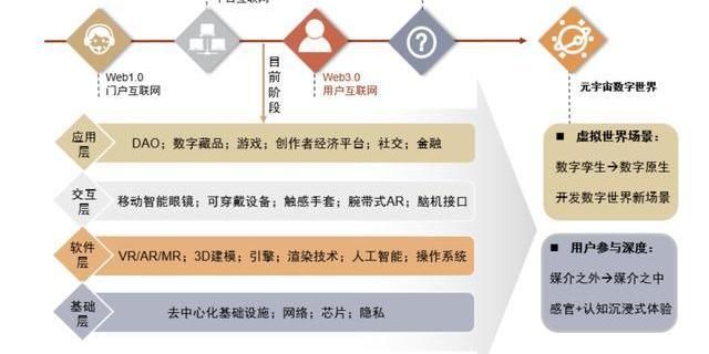 元宇宙是基于多种技术打造的虚实相生的数字世界,打通了线上线下次元壁,给用户带来沉浸式体验。基于现有的技术认知,元宇宙中的数字世界将在虚拟世界场景、用户参与深度方面有所升级。虚拟世界场景方面,元宇宙是平行于现实世界的时空,但该数字世界并非局限于对现实世界的数字复刻,而会逐步发展到数字原生阶段,在对现实世界实现精准孪生复刻之后,借助AI等技术在元宇宙数字世界中开发新场景。在用户参与深度方面,元宇宙中用户不仅仅是观看内容,而是能全身心地沉浸式交互,打通视觉、听觉、触觉、嗅觉、味觉、第六感等感官及认知体验,全方面地实现沉浸式状态,从在媒介之外的观看式互动模式,发展到生于媒介之中的深度交互。