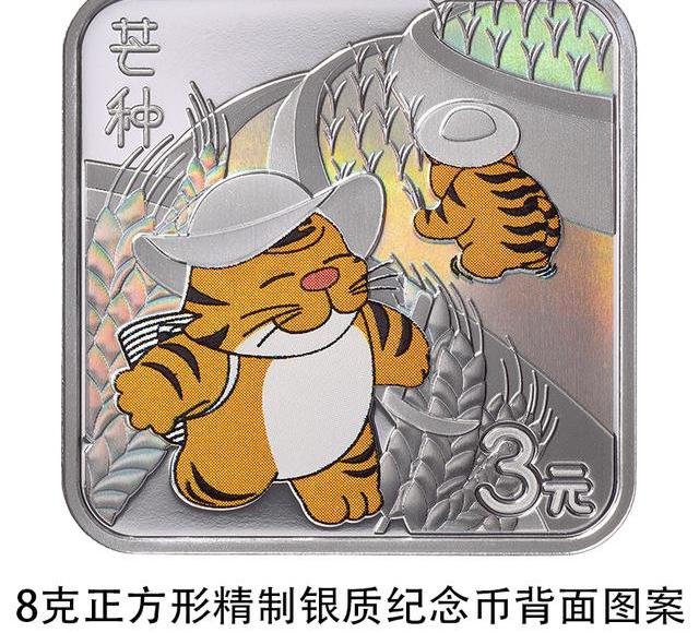 8克正方形银质纪念币背面图案以虎、小麦、稻苗为主要设计元素,展现芒种时节抢收抢种农忙景象,并刊“芒种”字样及面额。