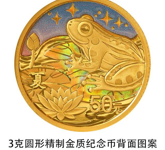3克圆形金质纪念币背面图案为装饰青蛙造型,衬以睡莲、星空等组合设计,并刊“夏”字样及面额。