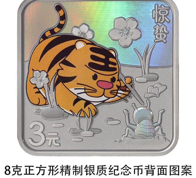 8克正方形银质纪念币背面图案以虎、蛰虫、桃花为主要设计元素,展现惊蛰时节“春雷惊百虫”物候现象,并刊“惊蛰”字样及面额。