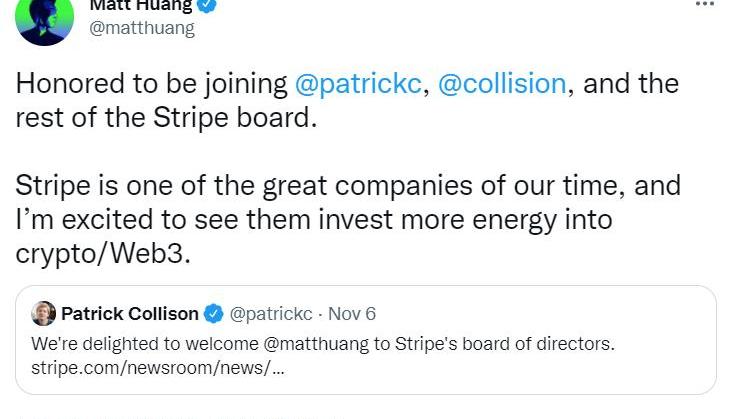 “我很高兴看到他们在加密货币/Web3方面投入更多精力,”Matt?Huang就其在Stripe的新董事会职位在Twitter上写道。