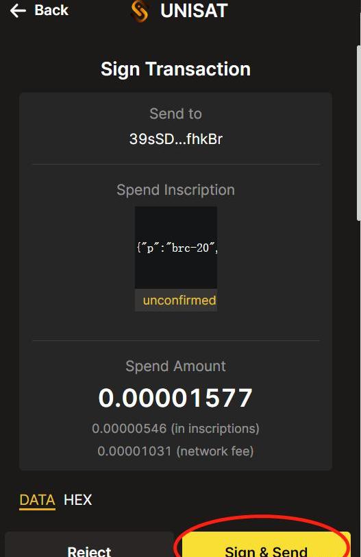 点击pay&inscribe进行付费和铭刻,这样就铸造好了,以上步骤做完后,Unisat钱包相当于做了一个非常完美动作,就时自动发给了自己,不需要哦再填写地址。