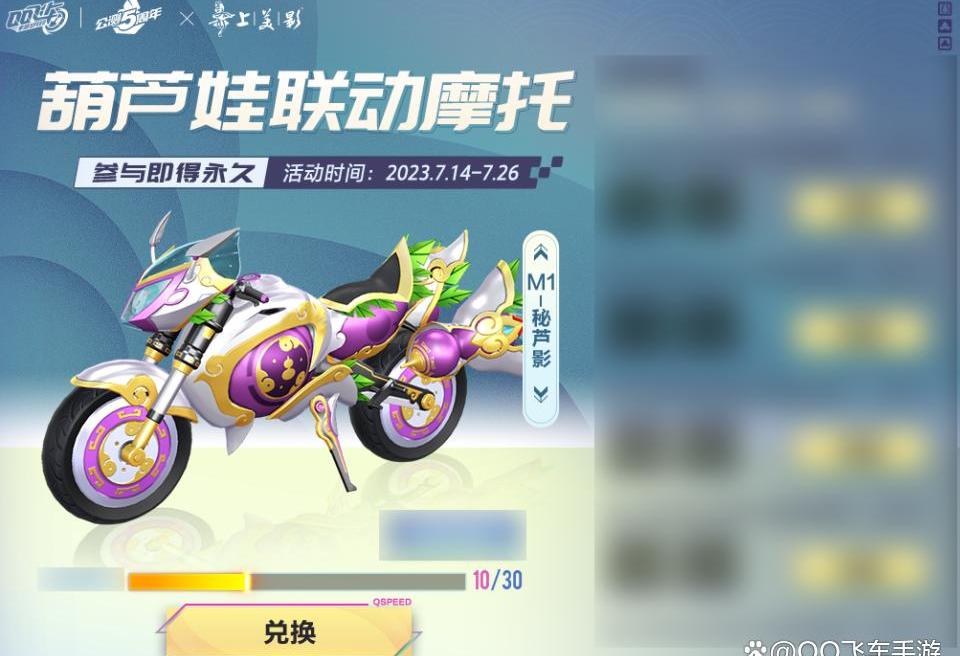 7月14日-7月26日,车手们登录游戏并完成指定任务即可获得车钥匙,累计获得一定数量的车钥匙,即可兑换葫芦娃联动M1摩托车秘芦影~
