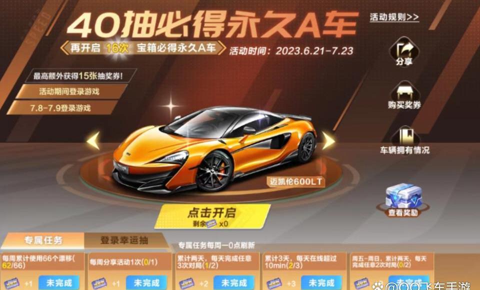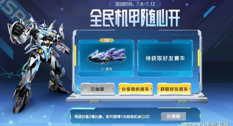 全民免费开机甲!即日起-7月12日,车手们登录游戏并完成指定任务即可随机获得1辆期限赛车!每位车手有且仅有1次抽取机会~