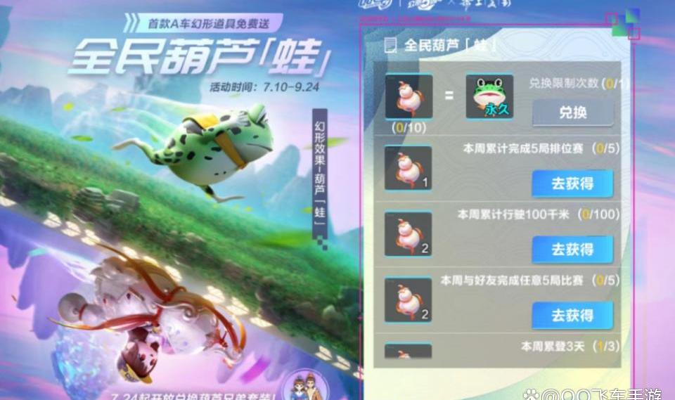 错过登录领取的玩家也能免费获得葫芦「蛙」啦!即日起-9月24日,车手们在活动期间完成每周任务,即可获取小葫芦,使用指定数量的小葫芦就可以兑换A车幻形道具葫芦「蛙」~