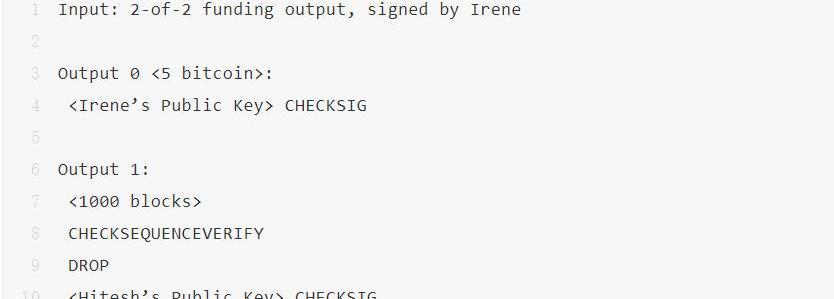 Hitesh拿到的由Irene签名的事务有两个输出,第一个输出不带时间锁,立即给Irene支付5btc,而第二个输出带有时间锁,支付5btc给Hitesh,但要等1000个区块之后,这个输出才能花用。详情如下: