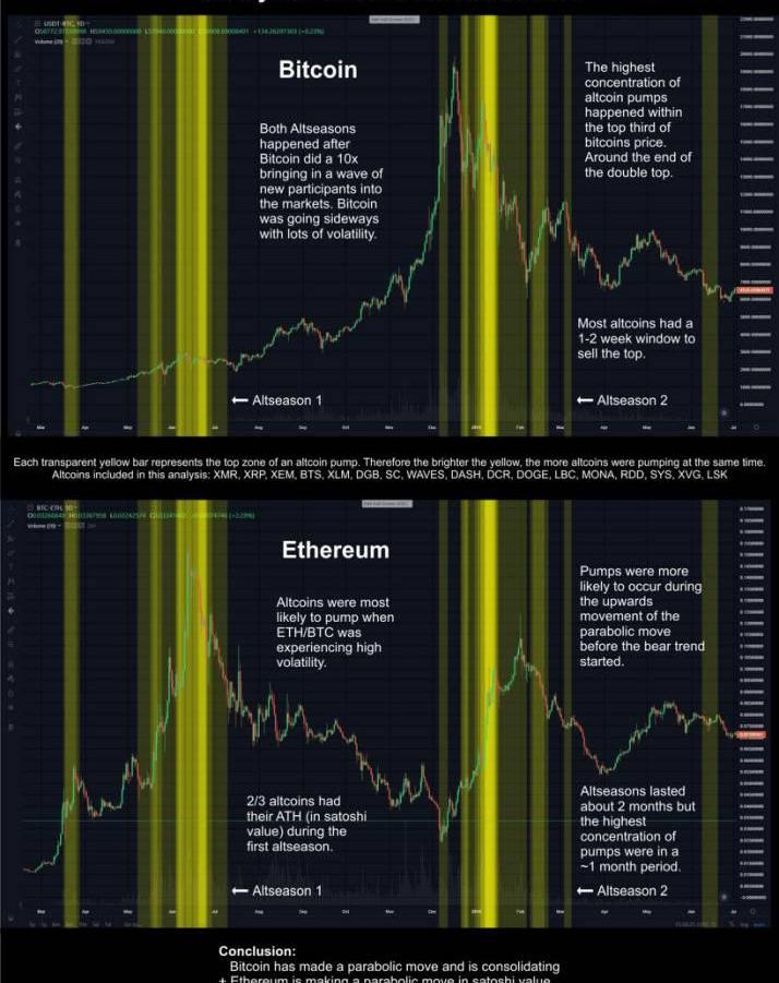 如果您想深入了解下发生在2017/18年的上一个周期的2次山寨币爆发期规律,请看下图分析:
