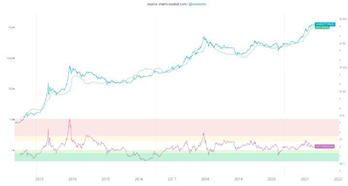通常情况下,aSOPR的短期顶部每次都会在更高的水平上出现,因为价格会进一步上涨,而不断上升的信心会导致人们在每次抛售后都持有更高的利润。