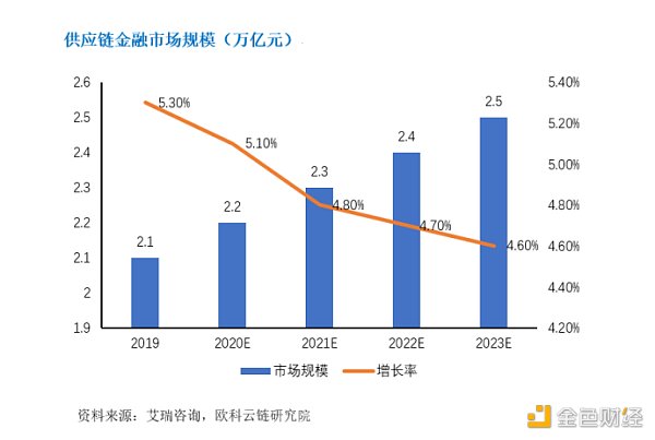 供应链金融中,银行围绕核心企业,通过管理核心企业上下游的资金流,在对核心企业供应链上下游的中小企业发放贷款时,就能有效控制风险,从而部分解决中小企业“融资难”和“融资贵”的问题。以供应链金融中较常见的应收账款质押贷款为例,作为应收账款付款人的核心企业,其资信好、付款能力强,违约风险较低,所以中小企业将应收账款向银行作为还款保证,其授信额度和融资成本自然也会下降。根据艾瑞咨询的调查,2019年供应链金融市场规模达2.1万亿元,同比增长5.3%;预计未来将增长至2.5万亿元。